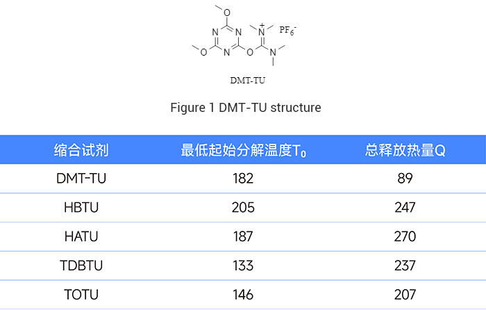 多くの凝縮試薬のうち,HATUなどのイオン凝縮試薬は,高反応性と優れたレーセミゼーション抑制のために広く使用されています.しかし、これらの試薬は高エネルギーの異原子結合(N-NおよびN-O結合など)を含み、熱安定性が悪く、潜在的な安全リスクをもたらします。これに対処するために、Kunishimaのチームは、DMT-TUと略称される新しい凝縮試薬2-(4,6-dimethoxy-1,3,5-triazin-2-yl)-1,1,3,3-tetramethyluronium hexafluorophosphateを開発した。