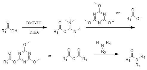 DMT-TUの作用メカニズムは次の通りです:カルボキシル酸は基質の存在下でDMT-TUと反応し,O-アシリスウレアを形成し,その後,トリアジン酸またはカルボキシル酸とさらに反応し,対応するトリアジンエステルまたはカルボキシル酸無水化物を形成し,最後にアミノ解解してアミド化合物を得ます.