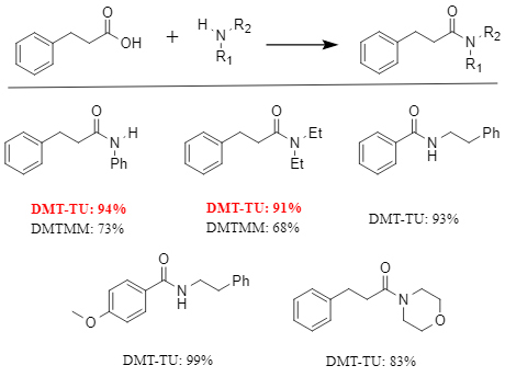 DMT-TUは効率的にアミド結合を構築することができ,反応収量が一般的に80%を超える芳香性基板とアリファス基板の両方に適しています(詳細は図を参照).アニリン/ディエチラミンとモデル基板としてのフェニルプロピオン酸の反応では,DMT-TUを使用して90%を超える収益率が達成されました.同じ条件下で,DMTMMを使用して対応するアミド収益率はそれぞれ73%と68%でした.これは、DMT-TUが優れた反応性を示していることを示しています。
