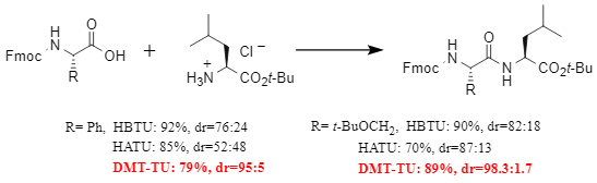 高反応性に加えて,優れた凝縮試薬は強力なレーセミゼーション抑制能力を持つ必要があります.Racemizableアミノ酸基板の比較実験では、DMT-TUは優れたracemization抑制を示し、HATUやHBTUのような伝統的な試薬よりも低いracemization比を達成した(図4参照)。