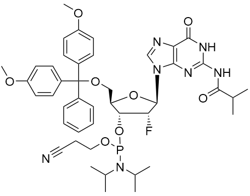 英語名:5'-O-DMT-2'-フルオ-N2-isobutyryl-2'-デオキシ-グアノジン 3'-セリウムホスフォラミダイト