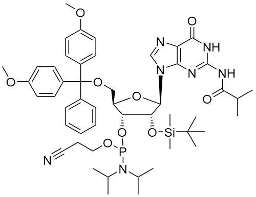 英語名:5'-O-DMT-2'-O-Tert-Butyldimethylsilyl-N2-isobutyrylguanosine 3'-CEのホスフォラミダイト