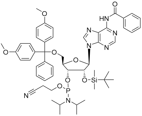 英語名:5'-O-DMT-2'-O-Tert-Butyldimethylsilyl-N6-Benzoyl-adenosine 3'-CEのホスフォラミダイト
